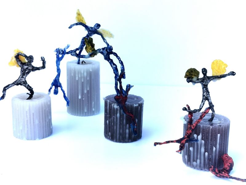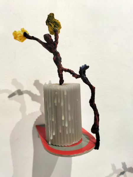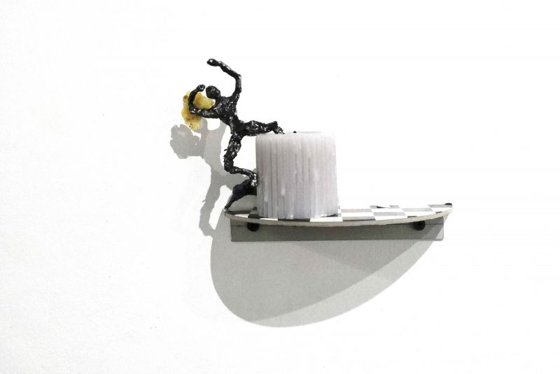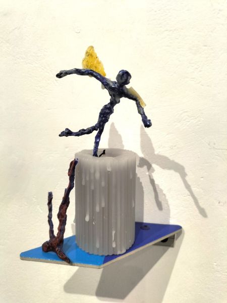 Transcendance et transgression - bronzes (extrait de la série Etreinte) - Moulages de Christ en plâtre et cire - règle en bois - Cloche en verre - pomme en cire - 2022