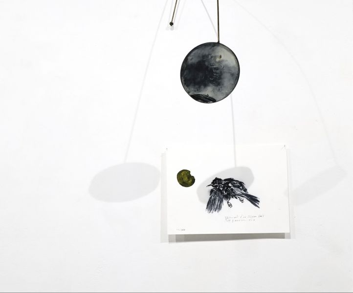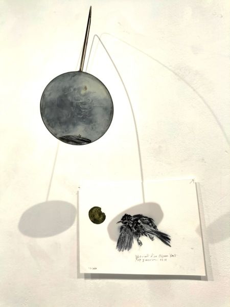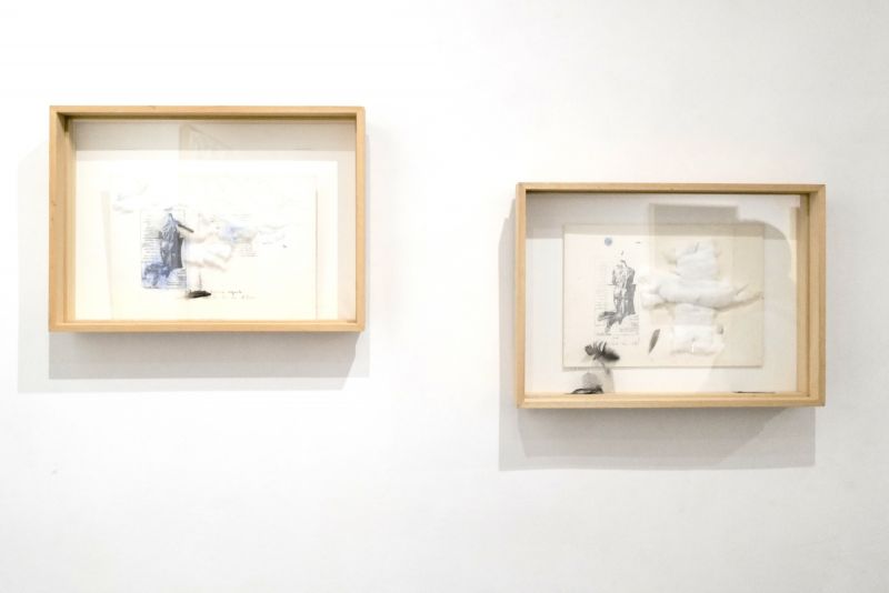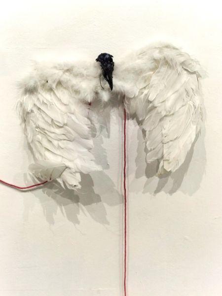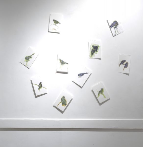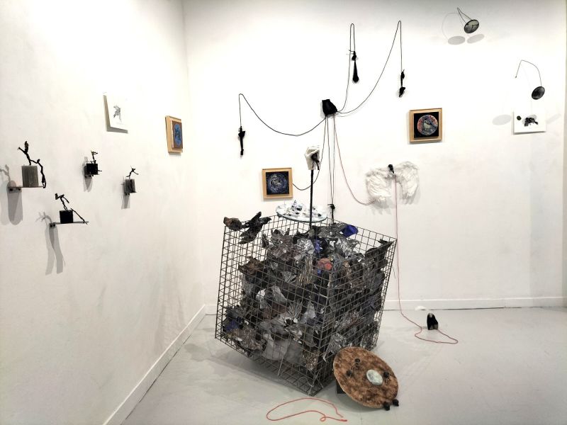 « L’échappée » papier - cire - photos - livres- chaines – aquarelles - moulages en plâtre - oiseaux empaillés